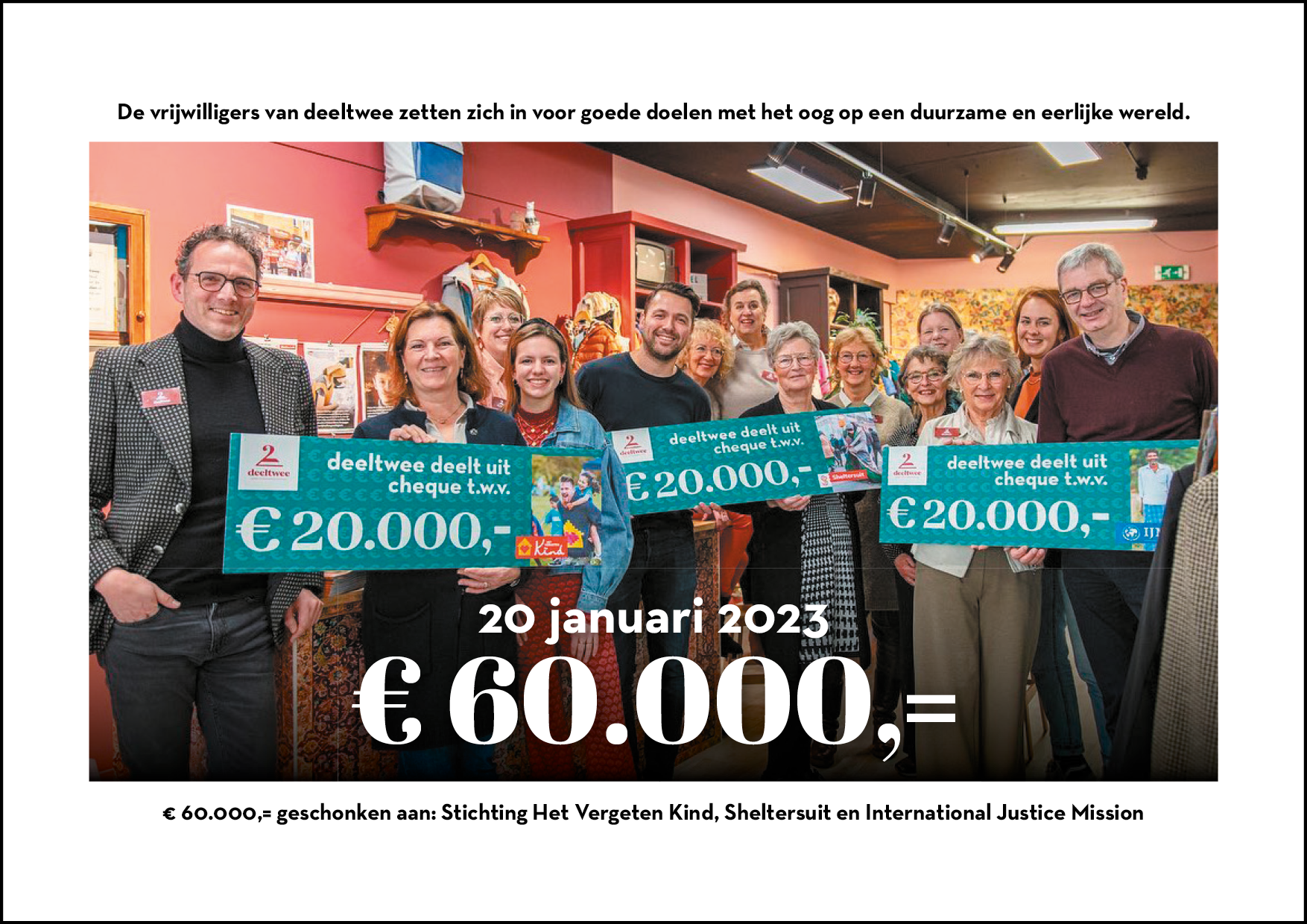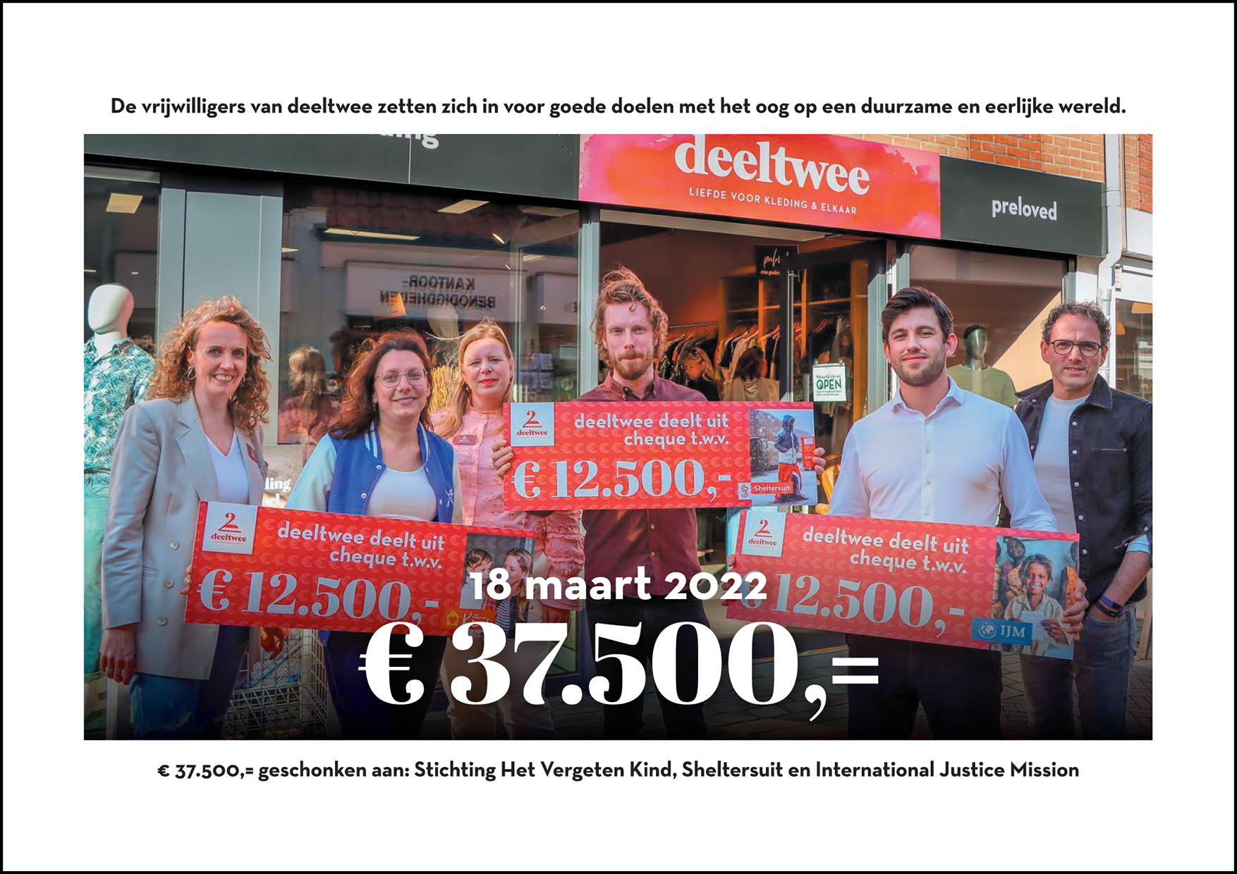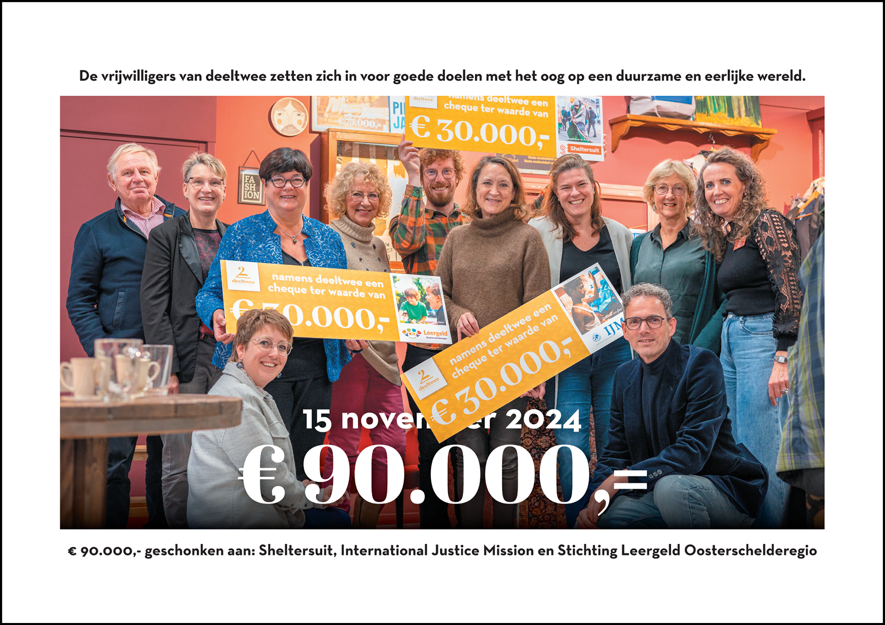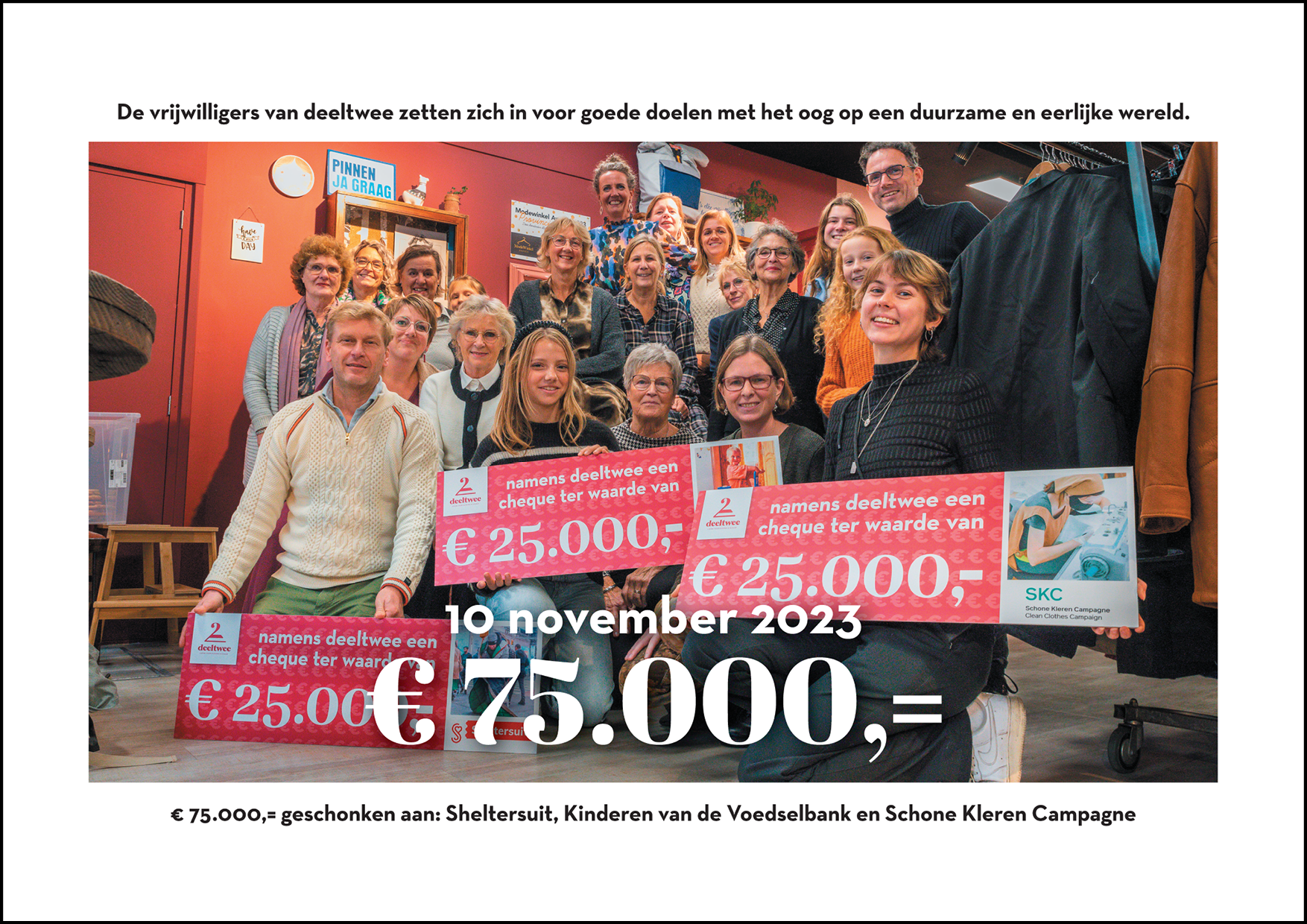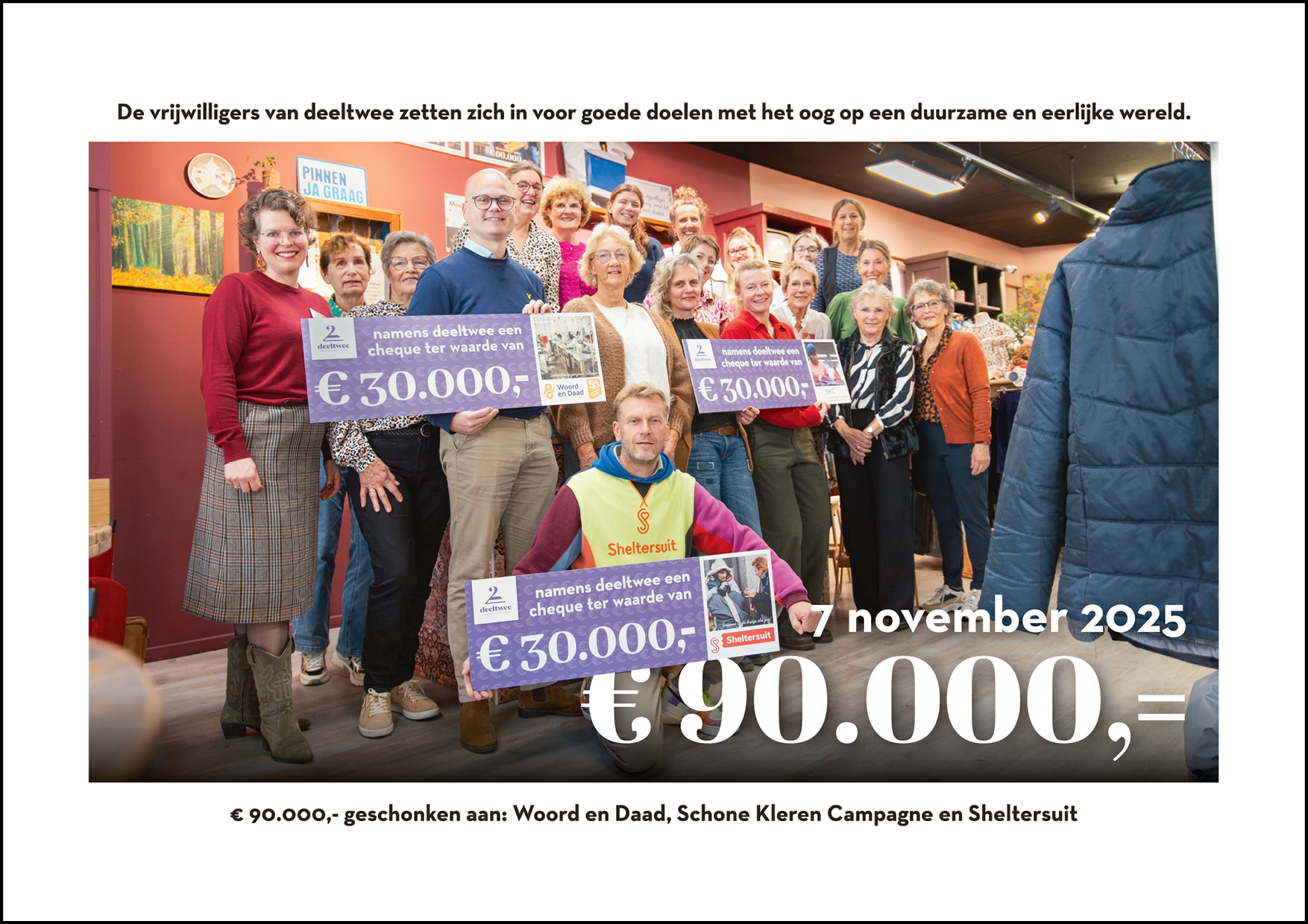 We werken met een betrokken team van bijna dertig vrijwilligers. Dankzij hun inzet kunnen we de kosten laag houden en ervoor zorgen dat de volledige opbrengst van de verkoop bestemd is voor goede doelen. Inmiddels hebben we bijna 400.000 euro kunnen uitreiken aan organisaties zoals Sheltersuit, International Justice Mission en Schone Kleren Campagne. Daar zijn we enorm trots op, en vooral op ons geweldige team dat dit samen mogelijk maakt. De betrokkenheid van bezoekers, donateurs en vrijwilligers maakt dat deeltwee inmiddels niet meer weg te denken is uit Goes. Wat wij in 2021 begonnen als een idee rondom fashion en hergebruik, is uitgegroeid tot een plek waar dagelijks mensen binnenlopen die bewust kiezen voor tweedehands én voor impact. Elke donatie, elke aankoop en elke vrijwilliger draagt bij aan wat wij samen mogelijk maken.